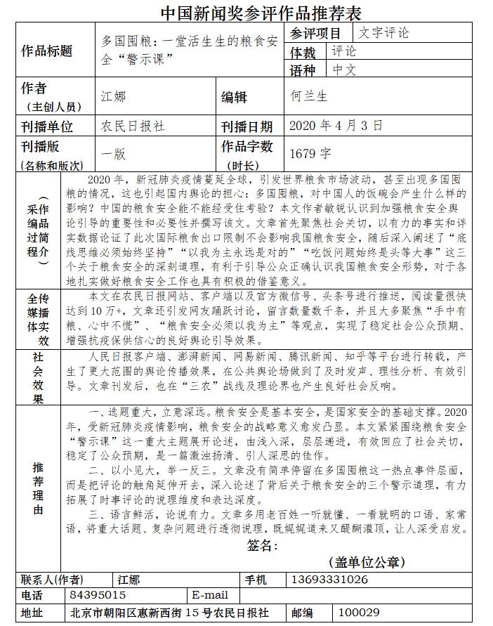 附件:中国新闻奖参评作品推荐表