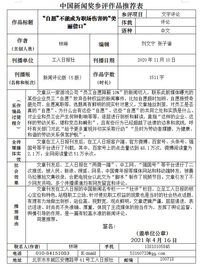 附件:中国新闻奖参评作品推荐表