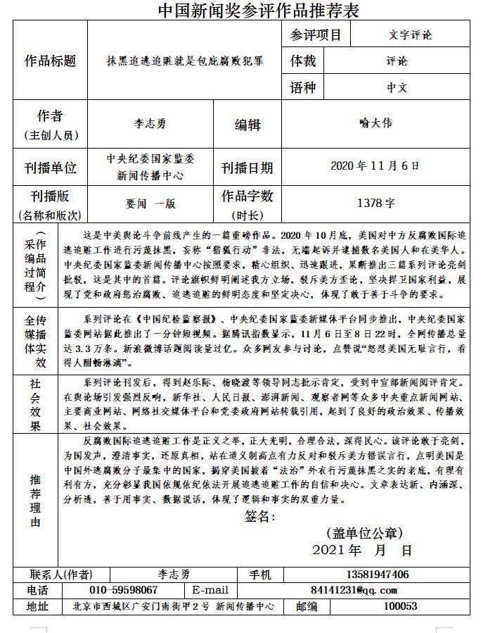 附件:中国新闻奖参评作品推荐表