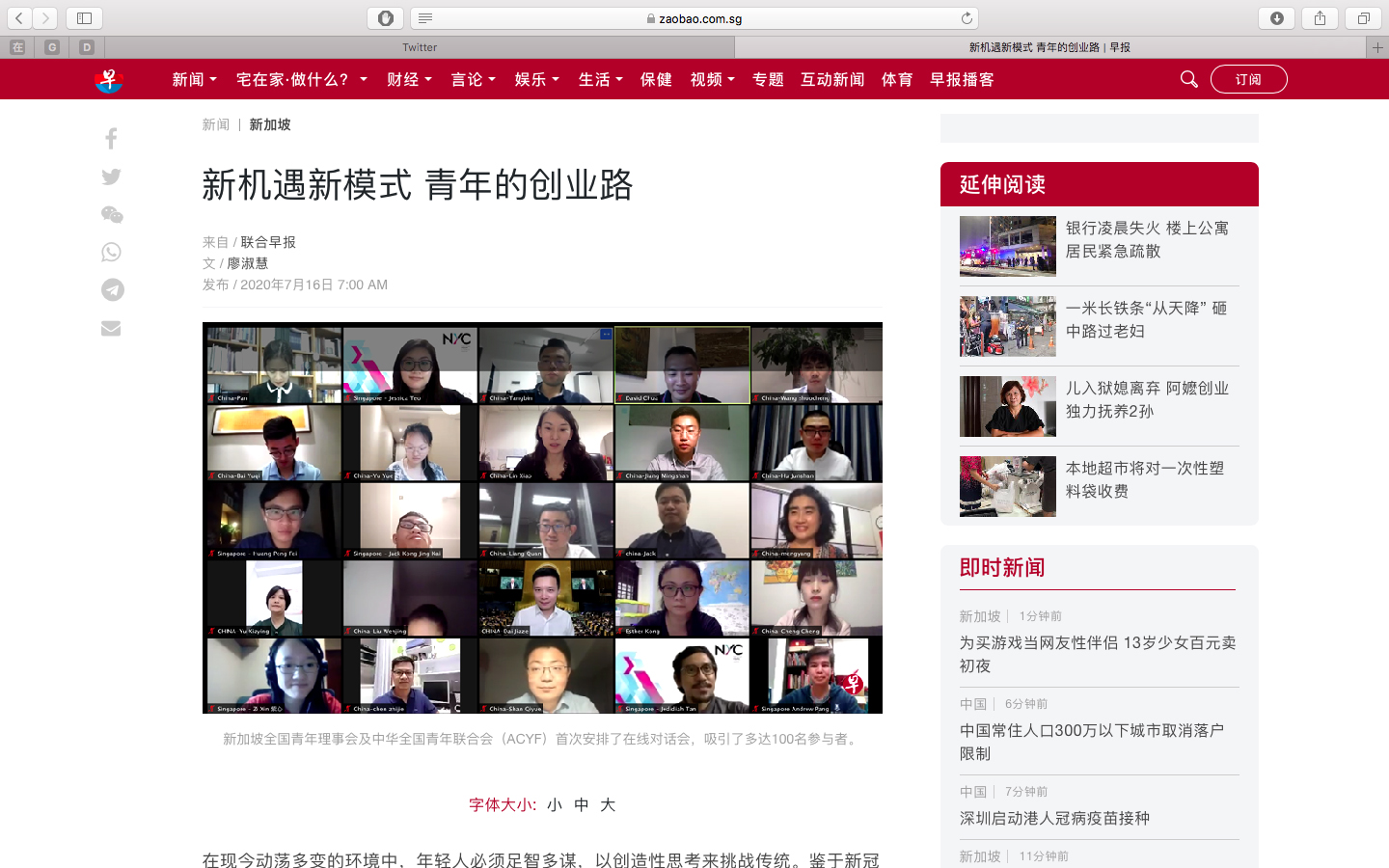 7月8日,由中华全国青年联合会和新加坡全国青年理事会共同主办的中新青年创新行动经验分享会在“云”上举办。两国上百名代表通过网络分享了疫情防控常态化背景下青年创业的新机遇、新模式,探讨如何加强合作,一起夯实中国和新加坡之间的友谊与合作,为青年的发展创造更多机会。