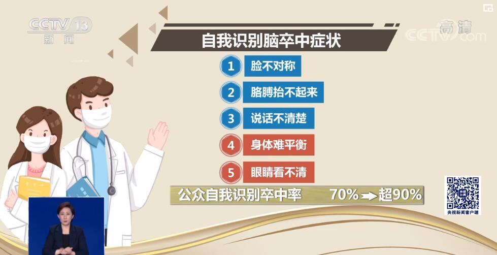 央视网消息: 此外,国际上早期还有一套公众自我识别3个脑卒中症状的方法:一是脸不对称、二是胳膊抬不起来、三是说话不清楚。由于脑结构的复杂性,近两年在此基础上又增加了两个识别症状:身体难平衡、眼睛看不清。这两个症状的增加可以使公众在家自我识别卒中率由原来的70%提高到超过90%。