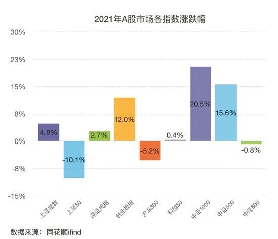 从个股股价涨幅角度来看,剔除2021年上市新股,共有323只个股股价翻倍,创2016年以来新高,湖北宜化、联创股份、森特股份位列A股年度涨幅榜前三甲;28只个股2021年股价跌幅在50%以上,三季报业绩大幅下滑的中公教育霸屏年度跌幅榜,累计下跌77.63%,成为年度表现最差股票。