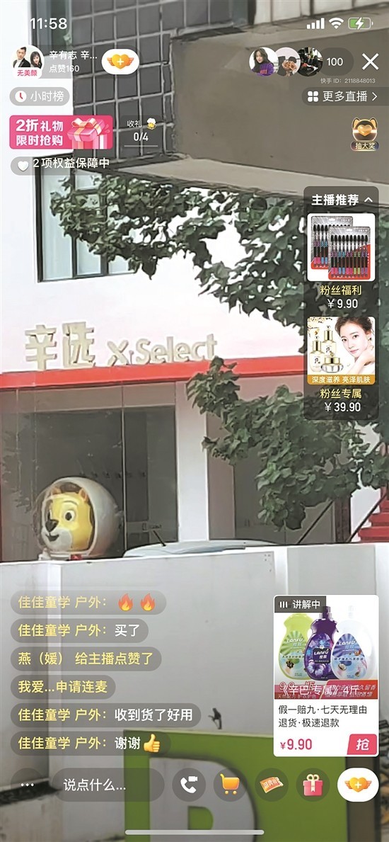 主播张鑫(化名)调整好手机角度,确保画面完整囊括了“辛选直播基地”六个大字后,他开始和直播间里的一百三十名观众互动,趁势推销一款仅需9.9元的“辛巴专属”洗衣粉。