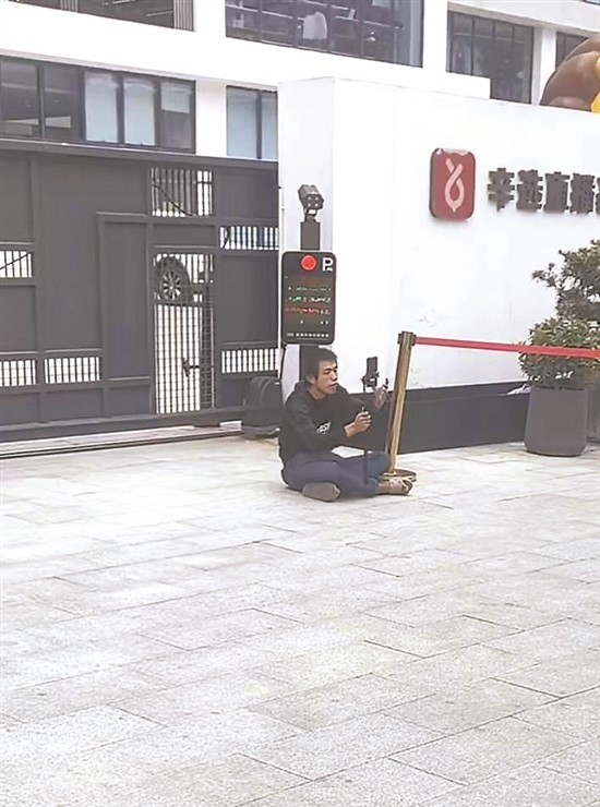 在直播基地门外,有着1.3万粉丝的主播二炮站在马路中间,举起手机镜头对准辛选基地的大门,开始向直播间里的几十名观众直播。他身后的一辆小货车频频鸣笛闪光,示意他避让,但他视若无睹。