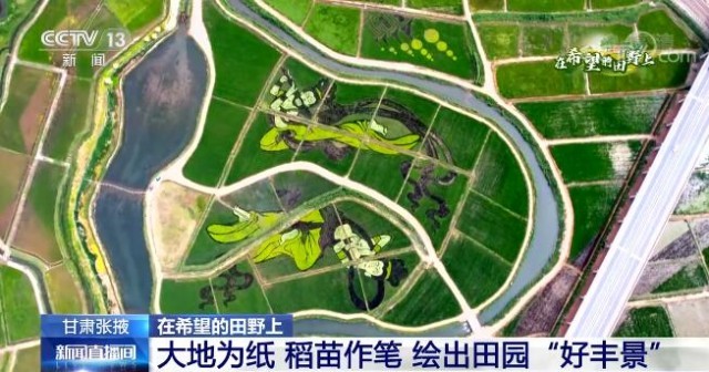 您现在看到的是甘肃省张掖市甘州区的乌江镇元丰村。从空中俯瞰,2000多亩彩色水稻色彩斑斓,多种颜色的彩色水稻种植绘制成稻田画,田园风光和生态美景尽展眼前。“丝路飞天、丝路驼铃、彩色飘带”等巨型画作,让地处河西走廊的村庄有了江南水乡的灵秀。兰新铁路、青蒙一级公路穿插其中,勾勒出一幅现代化农业的美好画面。过去,这里由于土地盐碱化,水稻单产较低,元丰村退出水稻种植。从2019年开始,元丰村通过高标准农田改造,疏浚河道,开挖盐碱沟,让水系循环了起来。土地达到种植条件后,重启水稻种植模式。农田整治与艺术的交融,实现经济效益、社会效益和生态效益三赢。