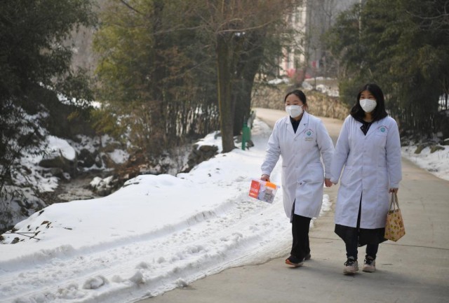 秦岭山中,西安市长安区滦镇街道沣峪村,几场冬雪过后,部分道路已经结冰,车行其间,轮胎不时打滑。山路虽难行,但药一定要送到老乡手里。滦镇街道卫生院医生崔思语和高丹阳将车停到路旁,索性提着“健康包”,步行前往老乡家里。
