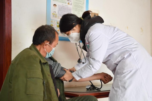 西安市长安区滦镇街道卫生院医生崔思语为沣峪村村民段春成测量血压。新华社记者邵瑞 摄