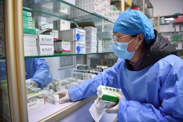 在西安市长安区滦镇街道卫生院,工作人员为患者配退烧止咳药。新华社记者邵瑞 摄