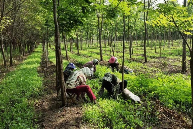 人们在育林林场水曲柳地打理间作的蒲公英。(受访林场供图)