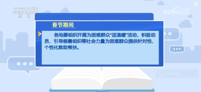 《通知》要求,春节期间,各地要组织开展为困难群众“送温暖”活动,积极动员、引导慈善组织等社会力量为困难群众提供针对性、个性化救助帮扶。