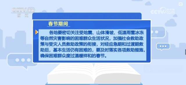 各地要密切关注受地震、山体滑坡、低温雨雪冰冻等自然灾害影响的困难群众生活状况,加强社会救助政策与受灾人员救助政策的衔接,对经应急期和过渡期救助后,基本生活仍有困难的,要及时落实各项救助措施,确保困难群众度过温暖祥和的春节。