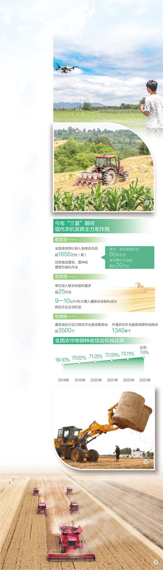 农业现代化离不开农业机械化。大农机和小农机协同发力的背后,折射出农业生产方式不断转变。今年“三夏”,全国各地预计投入各类农机具超1650万台(套),大型大马力农机、丘陵山区小型农机等部分机具初步实现了“有好农机用”,推动农业机械化迈上新台阶,全国农作物耕种收综合机械化率达到74%,农机作业面积超过73亿亩次。