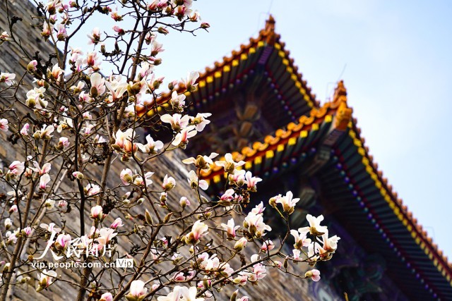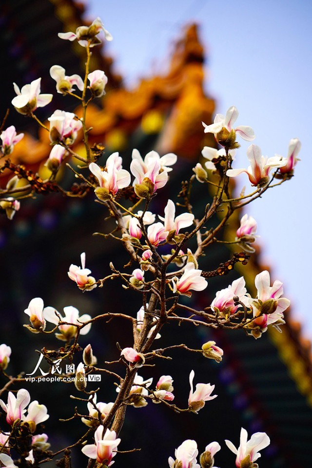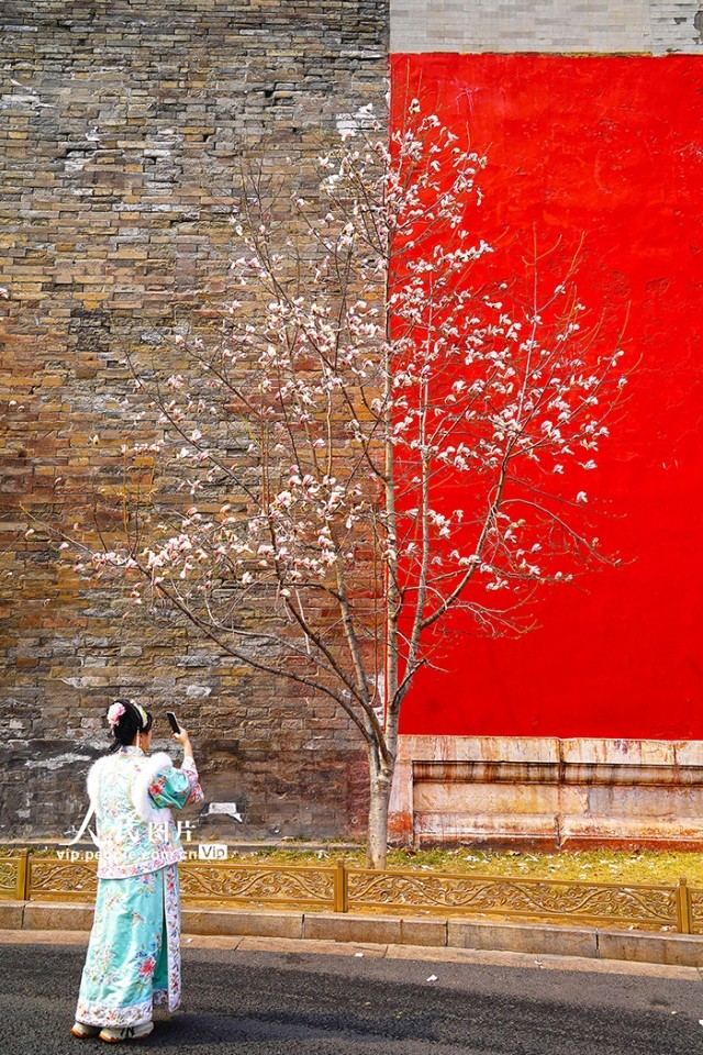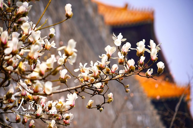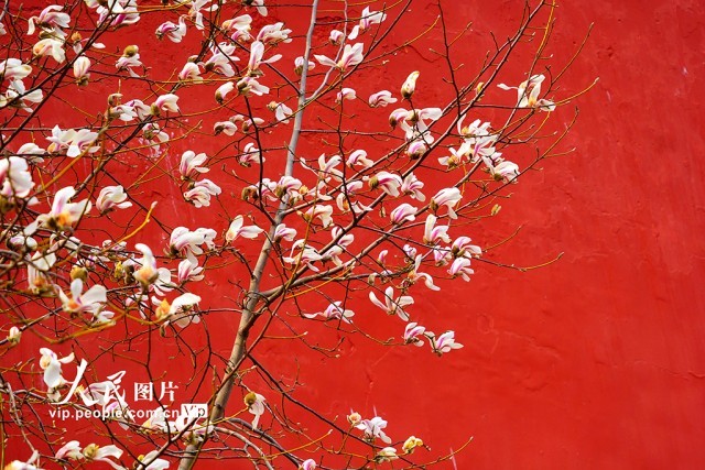 2025年3月10日,北京故宫东华门的玉兰花迎春绽放,红墙青砖与洁白如雪的玉兰花相互映衬,构成了一幅雅致有趣的画面。宋家儒摄(人民图片网)
