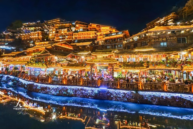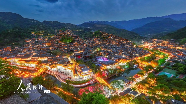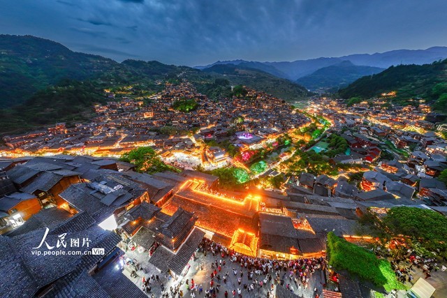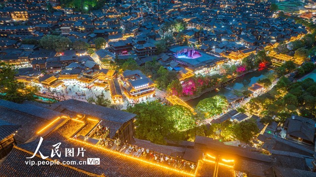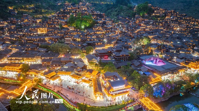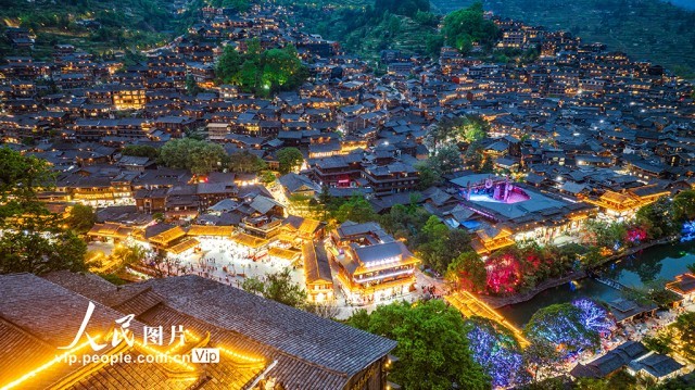 2025年4月16日,贵州省雷山县西江千户苗寨景区的夜景璀璨夺目,游客络绎不绝。朱红生摄(人民图片网)