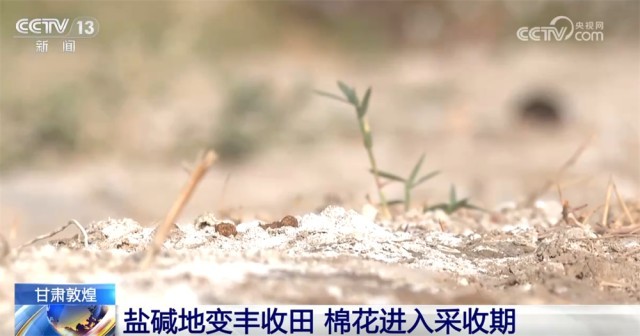 盐碱地土壤上方有白花花的盐碱层,它会导致土壤板结,也会让土壤养分流失。在这一块典型的盐碱地上,目前种植有四个棉花品种,农技部门会从中筛选耐盐碱性更强、适应性更好、产量更高的品种,进行下一步全面推广。