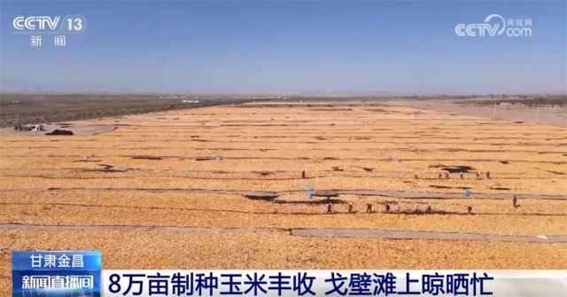 这几天,在金昌市永昌县水源镇附近的一块戈壁滩上,趁着晴好天气,当地农户把这里当成了天然的制种玉米晾晒台。从高空俯瞰,金黄色的玉米就好像一块块铺开的金色绒毯,农户们分散在各处,来回翻动着晾晒的玉米。今年,当地玉米种植面积达到45.37万亩,其中,制种玉米超过8万亩。