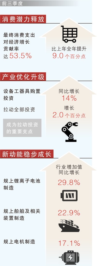 促进产业优化升级。财政政策打出组合拳,配套金融政策及时推出,推动了大规模设备更新改造。前三季度,设备工器具购置投资同比增长14.0%,拉动全部投资增长2.0个百分点,成为拉动投资的重要支点。与设备更新相关的计算机及办公设备制造业、通用设备制造业、铁路船舶航空航天和其他运输设备制造业投资分别增长7.4%、11.8%、22.3%。