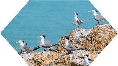 鸟群中,中华凤头燕鸥尤为醒目,黑色冠羽、嘴呈黄色、喙尖黑色。这一物种曾一度消失63年,是国家一级保护野生动物,如今全球仅200余只。近年来,通过人工招引和种群恢复,五峙山列岛已吸引155只中华凤头燕鸥,成为其在全球的第二大繁殖地。