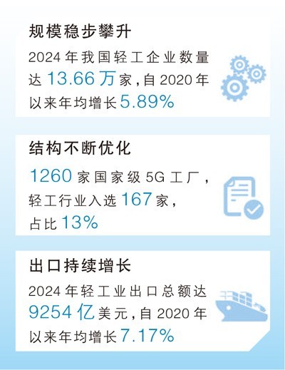 看行业规模,2024年我国轻工企业数量达13.66万家,自2020年以来年均增长5.89%;看市场表现,轻工重点产品零售额达7.93万亿元,占社会消费品零售总额的16.2%;看出口情况,出口总额达9254亿美元,自2020年以来年均增长7.17%。