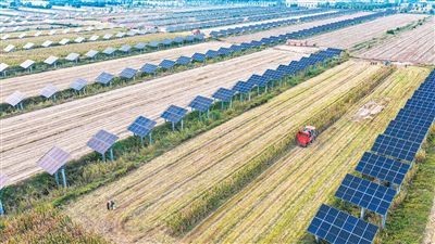 山东省乐陵市铁营镇近年来持续对11万亩盐碱地区域进行综合开发利用,采取“光伏+种植”复合模式,形成一地多用的“农光互补”发展新格局,实现了盐碱地生态效益和经济效益的双丰收。图为日前,当地农民在“农光互补”间作田里收获玉米。 贾鹏摄(人民视觉)