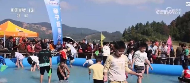 捕鱼现场,一系列互动活动同步展开。钓鱼比赛区内,二十多位钓鱼爱好者各显身手,一较高下;捉鱼体验区中,大人孩子共同下水,有的在浑水中徒手摸鱼,有的在水池边持网捕捞,尽情沉浸于捕鱼的乐趣中。