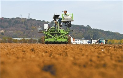 在山东省烟台市农科院试验田里,农机手驾驶播种机播种冬小麦。