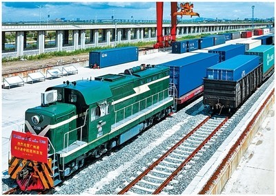 广州港南沙港区开行首趟中欧班列。