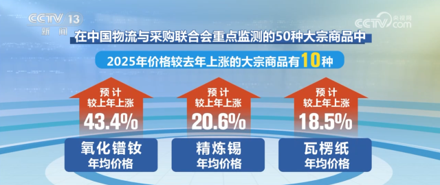 报告指出,2025年中国大宗商品价格指数均值预计为112.1点,较上年下降0.1%。在中国物流与采购联合会重点监测的50种大宗商品中,2025年价格较去年上涨的大宗商品有10种。其中,氧化镨钕、精炼锡和瓦楞纸年均价格预计较上年分别上涨43.4%、20.6%和18.5%。