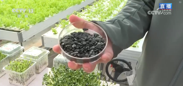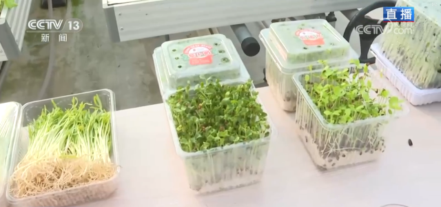 除了大棚里种,还有在架子上长的盒装芽苗菜,有瓜子苗、空心菜苗、萝卜苗、豌豆苗、香椿苗。每天的“营养”是纯净水,主要靠种子自身能量生长。定制光谱设备让芽苗菜在生长全周期获得适宜光照,种植全程无污染,一天产量可以达到5000多盒。配送前要预冷到5—10℃,可以常温配送到居民餐桌。
