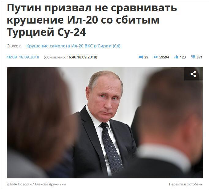 【编译/观察者网 杜津】针对俄伊尔-20军机被叙利亚防空系统击落一事,俄罗斯总统普京表示,这是偶然情况,不能将此事与2015年土耳其击落俄战机相提并论。