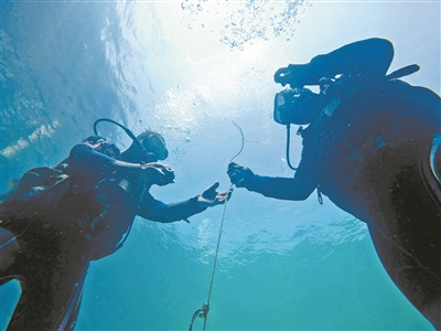 上图:水下安置爆破器材。唐 立摄