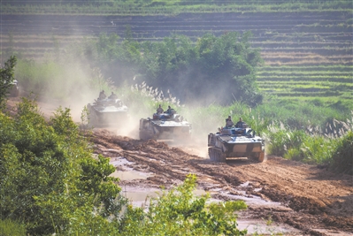 第73集团军某旅合成营战术演练中,“红四连”所在的装甲分队正在快速向战场机动。刘志勇摄