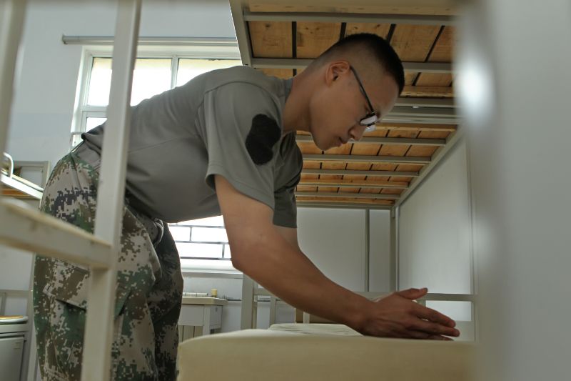 韩博宇正在整理内务。吉小平/摄