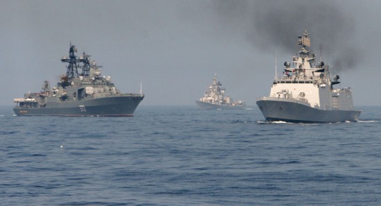 俄罗斯海军与印度海军联合演习画面