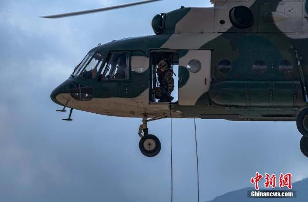 4月19日,中国人民解放军西藏军区某旅女兵分队,10余名高原女兵在高原训练场独立完成首次直升机武装机降。据悉,这次实装训练,女兵分队全部按照实战化要求进行披挂,采取双人编组,独立作业的方式进行。图为女兵分队正在进行机降训练。中新社发 王述东 摄