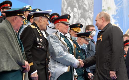 普京总统步入阅兵观礼台,与二战老兵握手。(俄罗斯总统网站)
