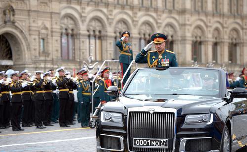 俄罗斯国防部长绍伊古乘坐“阿鲁斯”(Aurus)敞篷车检阅部队。(俄罗斯总统网站)