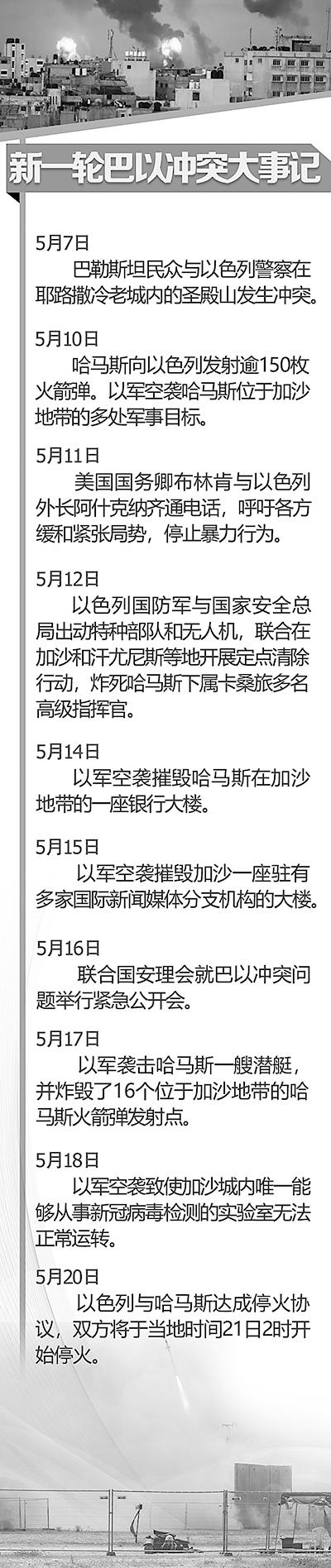 在国际社会的积极斡旋调停下,以色列和巴勒斯坦伊斯兰抵抗运动(哈马斯)于5月20日达成停火协议,标志着双方自2014年以来规模最大、烈度最高的冲突暂时平息。