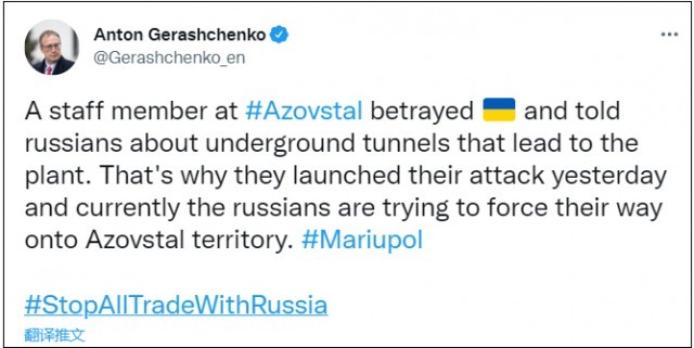 乌克兰内政部长顾问安东·格拉申科(anton gerashchenko)当天在推特发文称,亚速钢铁厂的一名工作人员背叛了乌克兰,并告知俄罗斯人一条通往工厂的地下隧道。格拉申科称,这就是俄罗斯5月3日突然发动攻击的原因。