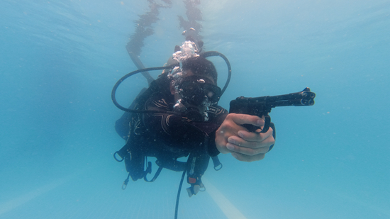 “水下射击不同于陆地实弹射击。水下射击压力大,加上水流不定、能见度低,无论呼气还是吸气,都会对射击产生影响。”该旅潜水教员戴世宝介绍,为了进一步提高特战队员水下快速射击的能力,他们创新探索使用水下罗盘和深度表相结合的方式进行水下“盲射”训练,队员们在近似实战的环境下,锤炼了过硬的水下作战本领。