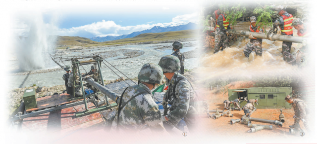 图①:管线悬挂穿越训练。图②:抢修受损管线。图③:开设泵站。李周熹、唐 睿摄