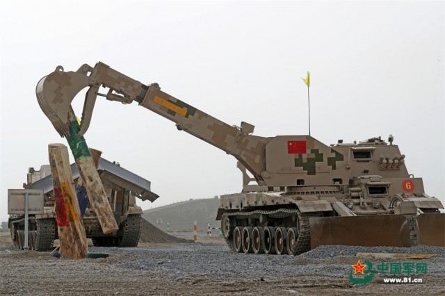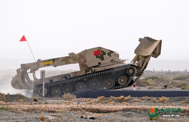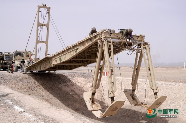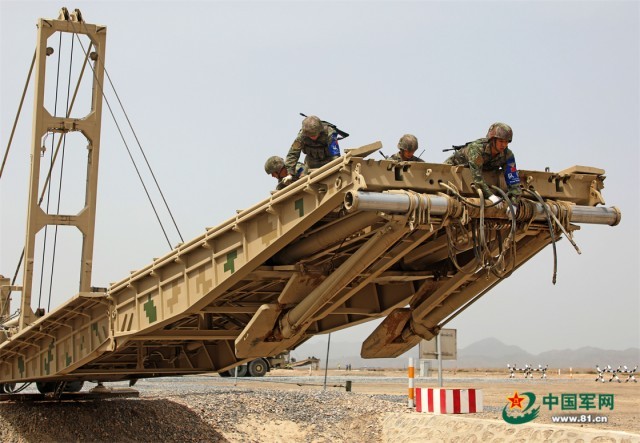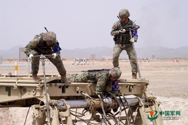 “国际军事比赛—2022”中国库尔勒赛区进行“安全路线”单项赛架桥组比赛,中国参赛车组架桥作业。 罗兴仓 摄