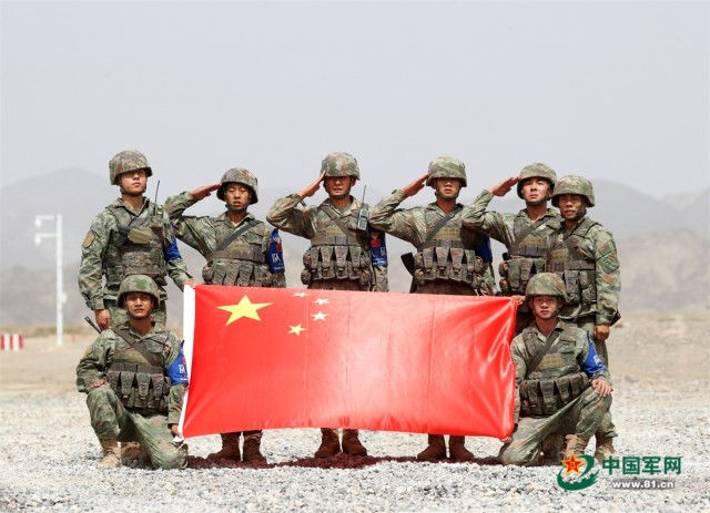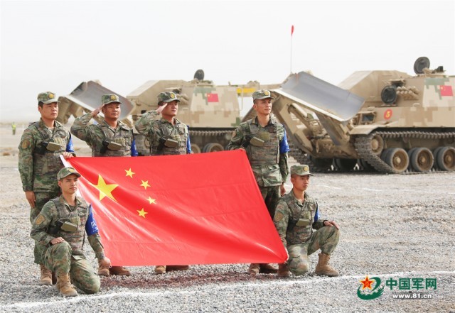 “国际军事比赛—2022”中国库尔勒赛区进行“安全路线”单项赛架桥组比赛,中国参赛队员展示国旗。罗兴仓 摄