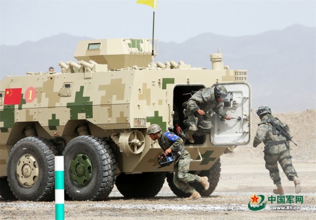 “国际军事比赛—2022”中国库尔勒赛区进行“安全路线”单项赛突击工兵班比赛,中国参赛队员快速下车。张永进 摄