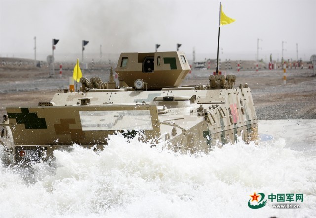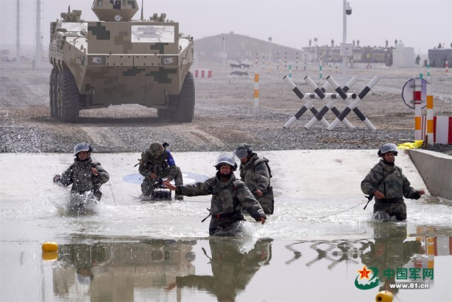 “国际军事比赛—2022”中国库尔勒赛区进行“安全路线”单项赛突击工兵班比赛,中国参赛队车组通过浅滩。张永进 摄