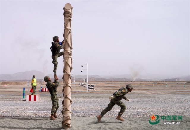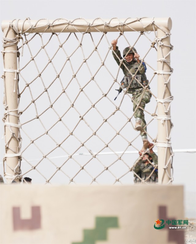 “国际军事比赛—2022”中国库尔勒赛区进行“安全路线”单项赛突击工兵班比赛,中国参赛队员翻越网墙。栾铖 摄