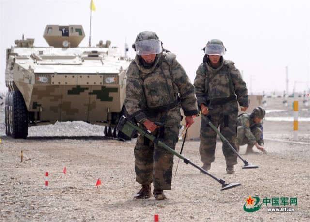 “国际军事比赛—2022”中国库尔勒赛区进行“安全路线”单项赛突击工兵班比赛,中国参赛队员扫雷作业。栾铖 摄