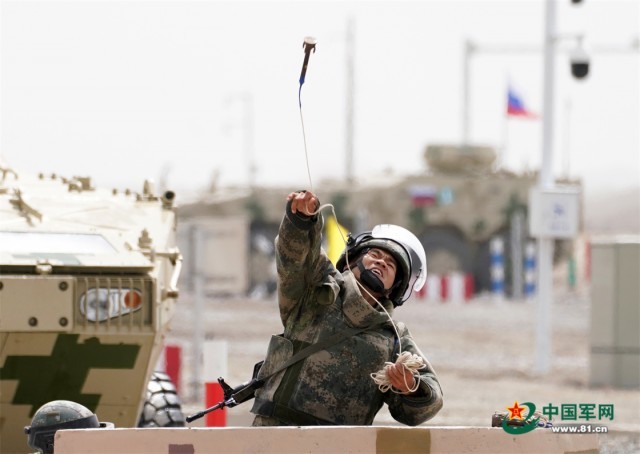 “国际军事比赛—2022”中国库尔勒赛区进行“安全路线”单项赛突击工兵班比赛,中国参赛队员投掷扫雷锚。张永进 摄