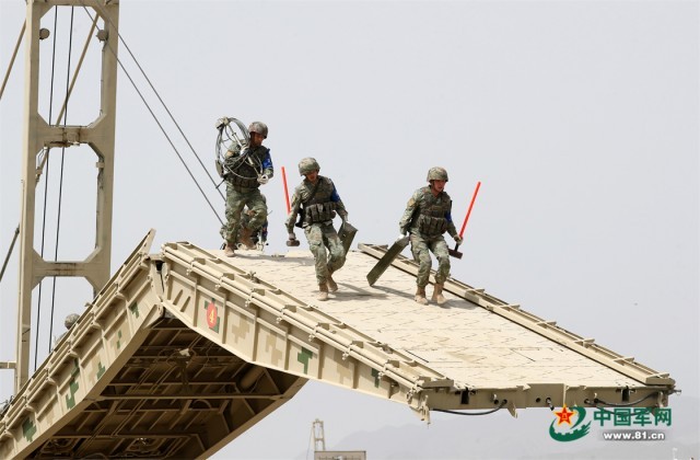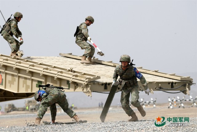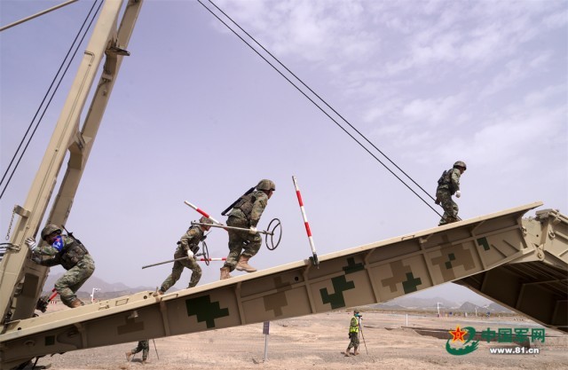 “国际军事比赛—2022”中国库尔勒赛区进行“安全路线”单项赛架桥组比赛,中国参赛队员架桥作业。罗兴仓 摄