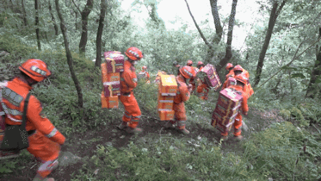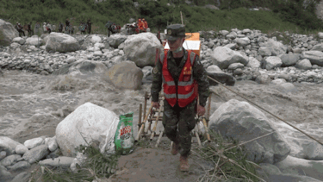 9月7日上午,武警四川总队机动第二支队受领为泸定县磨子沟村运送物资的任务。地震后,该村因为道路损毁,村民受困,支队派出40余名官兵携带生活物资向磨子沟村挺进。一路上,官兵们背着物资,走过湿滑难行的山路,途中多次攀爬近乎垂直的坡道,还要注意随时掉落的碎石。经过两个半小时艰难跋涉,官兵终于到达磨子沟村,把生活物资送到了村上的安置点。